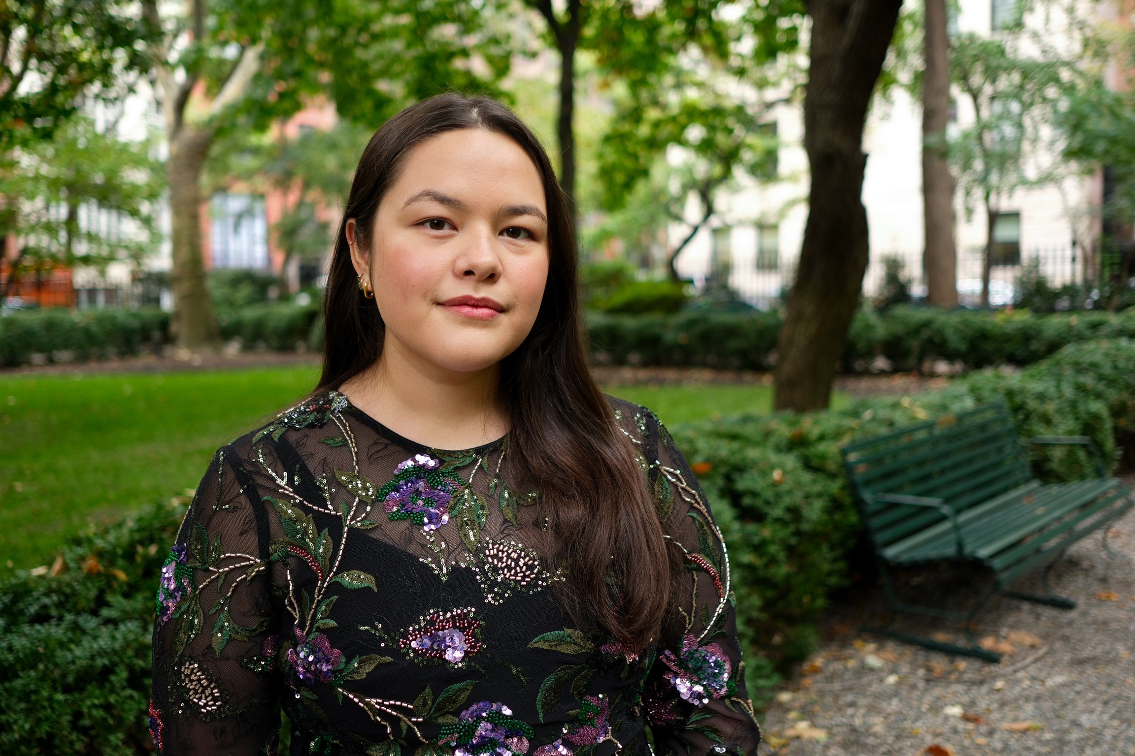 A young woman with long dark hair and a cheerful smile standing outdoors near a tree in a park with green foliage and buildings in the background.